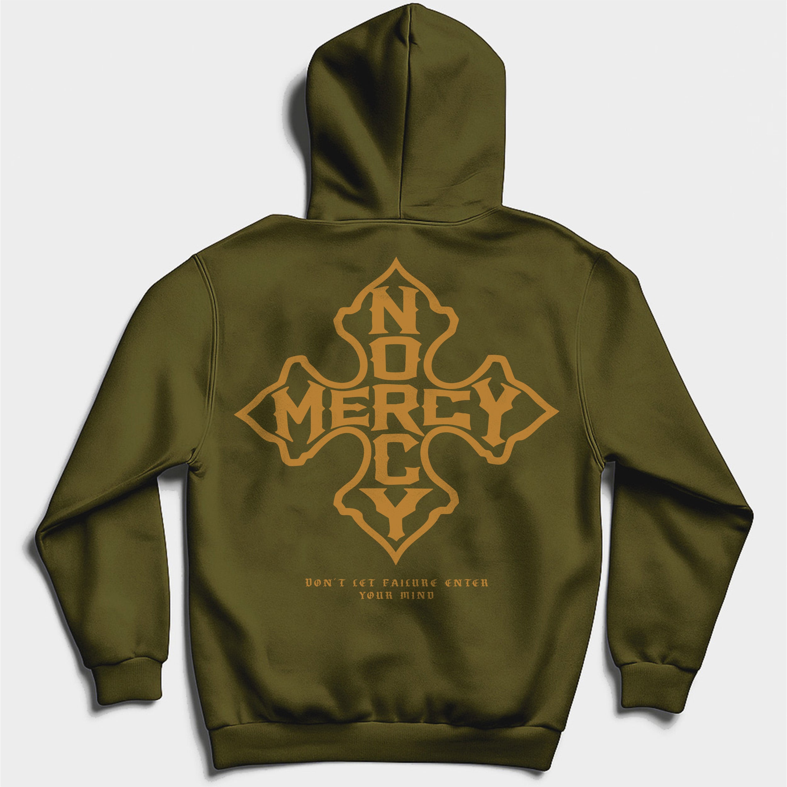 Centered on the back is the bold Iron Cross No Mercy emblem, a powerful symbol of resilience and discipline. Beneath it sits the message: “Don’t Let Failure Enter Your Mind.” A reminder that the real battle happens long before the mat, the gym floor, or the ring — it happens in your head.